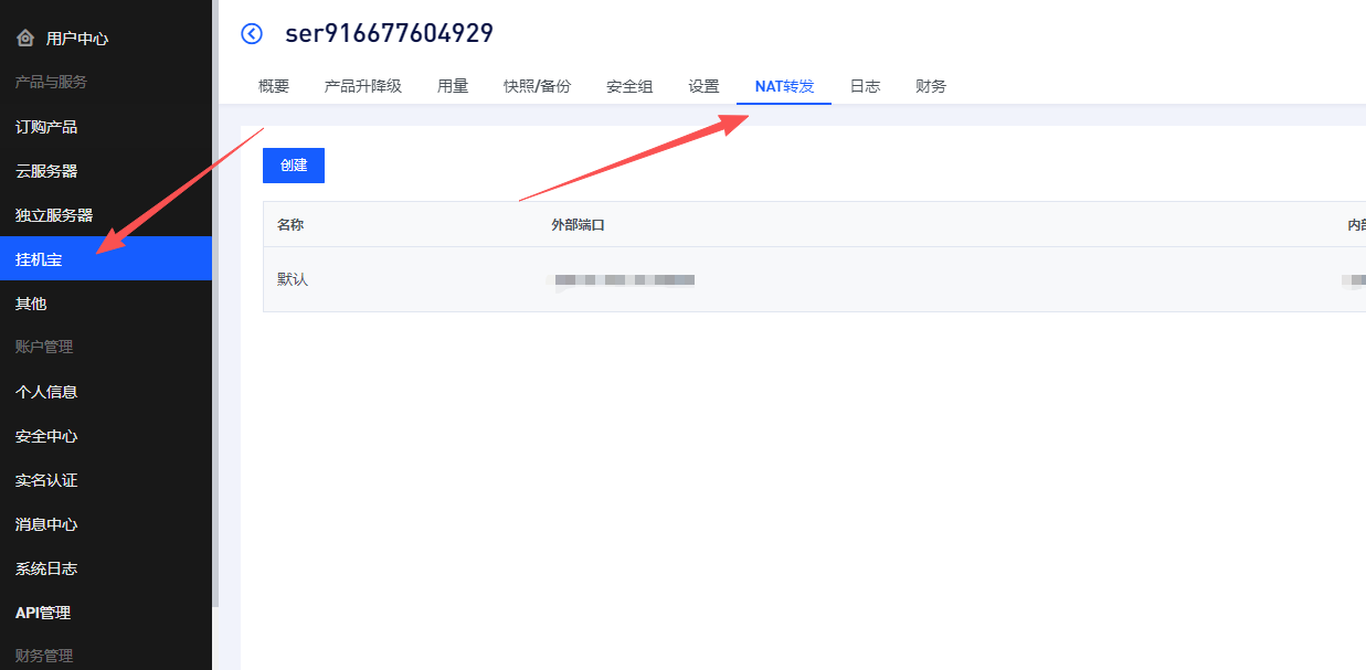 2、登陆玖趣云后台,找到购买的挂机宝,点【NAT转发】,创建,